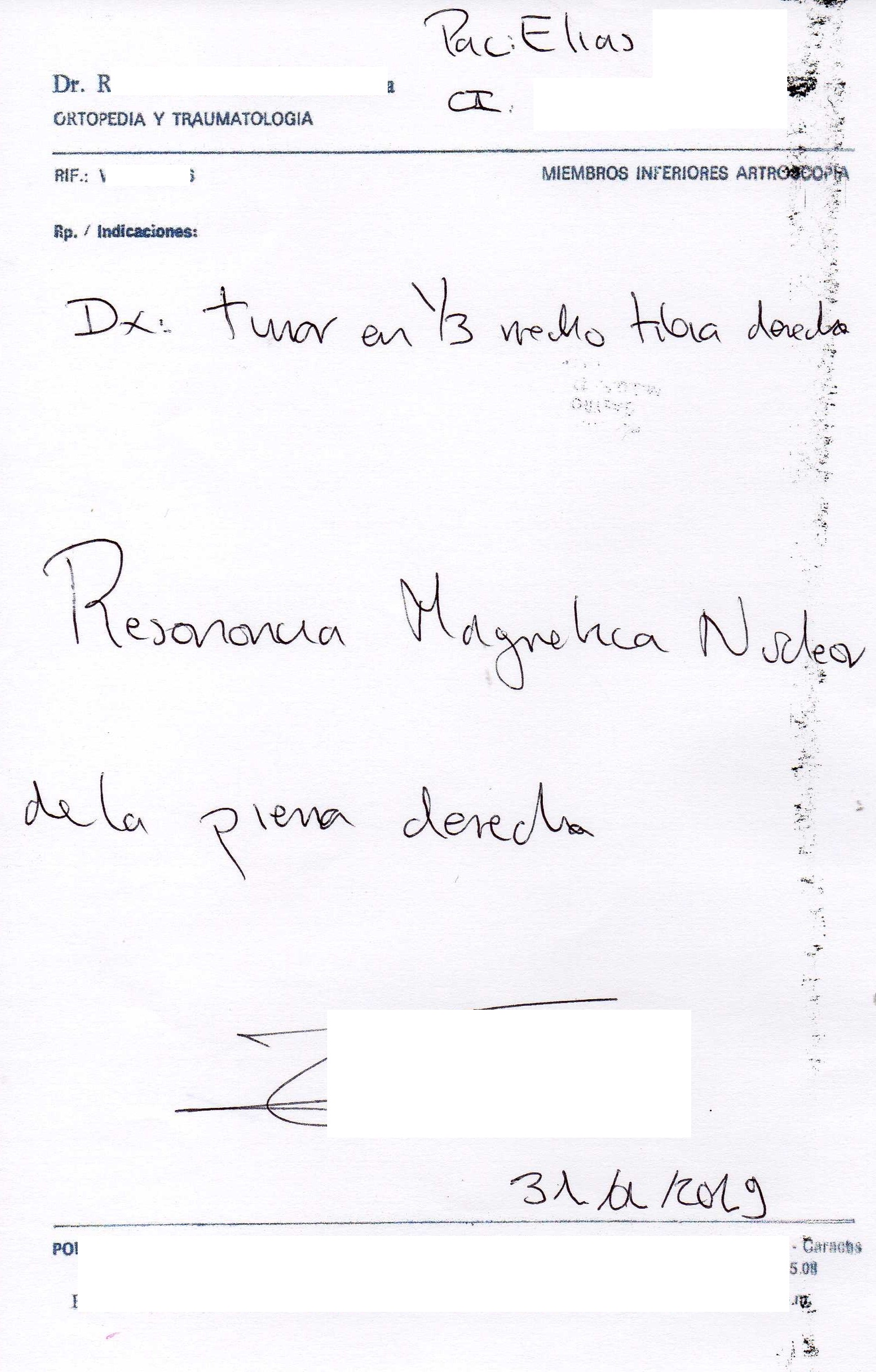 Elías requiere Rx y Resonancia Magnética urgentes, para corroborar y ratificar protocolo a seguir, fijando biopsia, eliminación por vía quirúrgica y posible tratamiento con radiofrecuencia.