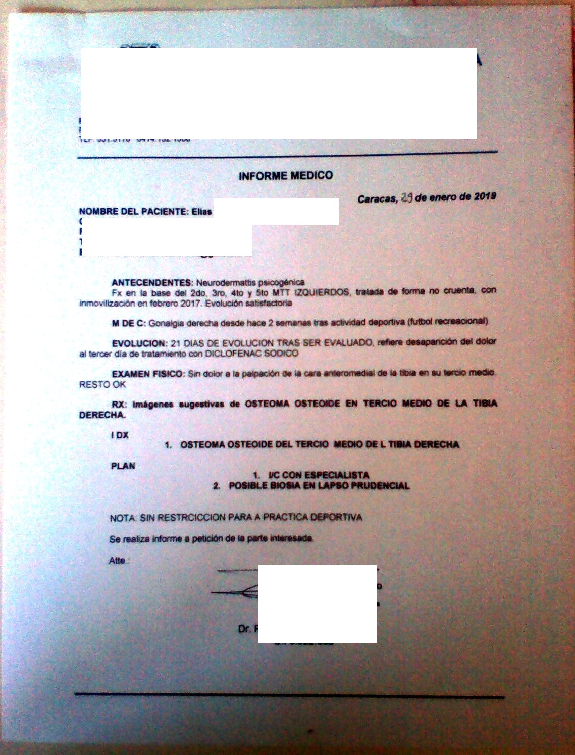 Dear community, the diagnosis for Elías, my 12-year-old son, is, so far: Osteoid Osteoma of the middle third of his right tibia.