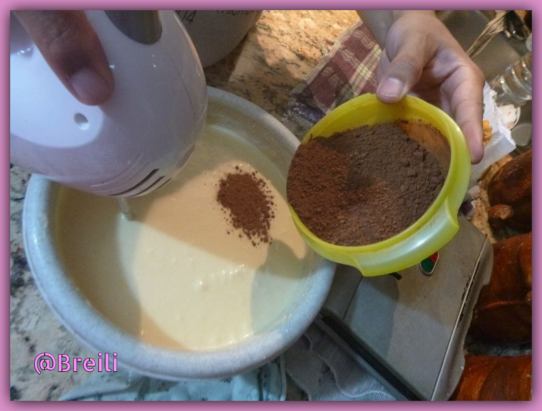 Llegó mi parte favorita, agregamos el cacao en polvo y disfrutamos viendo como adquiere color la preparación, además de un aroma delicioso a chocolate.