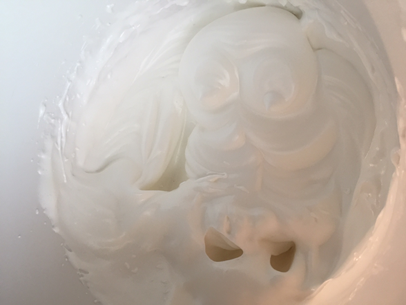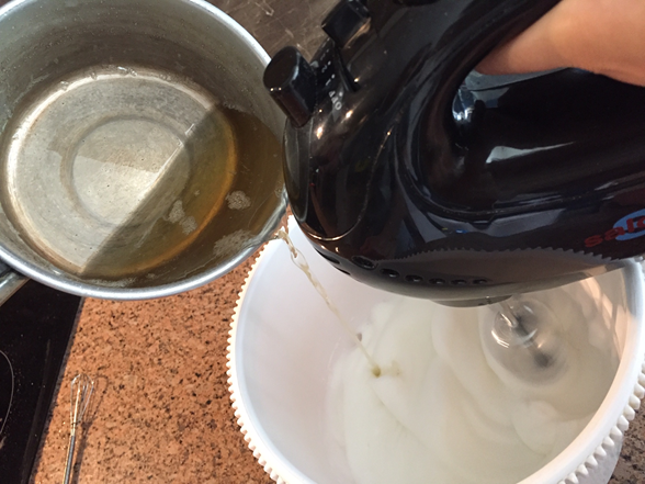 Batimos las claras, mientras le colocamos poco a poco la mezcla anterior, batiendo a velocidad media. Batimos durante 7 minutos.