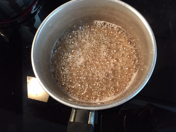 Colocar el agua en una olla, añadir el azúcar y mezclar. Calentar mientras batimos hasta que se formen muuuuchas burbujas.