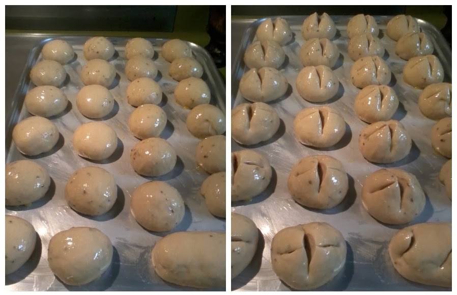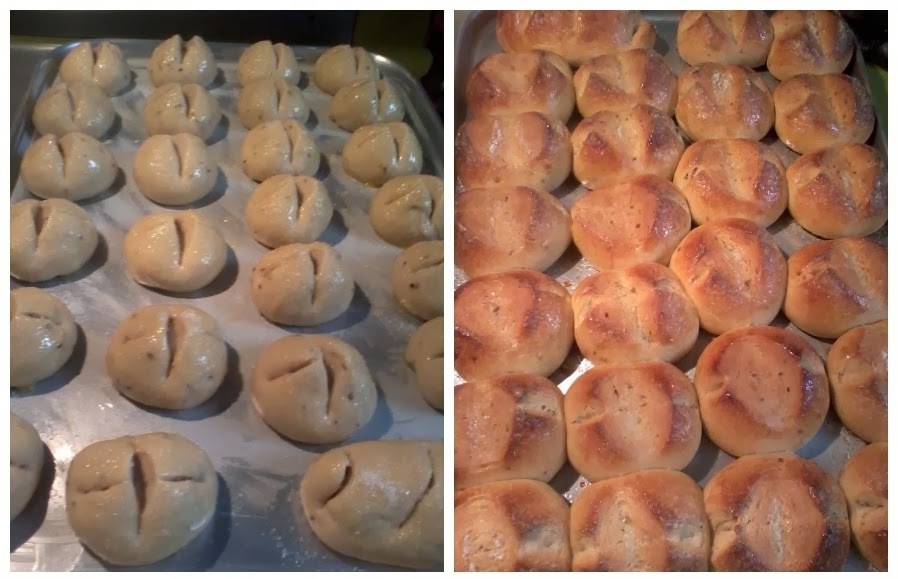 Luego barnizar con huevo batido, hacer hacer cortes en cruz y se agrega el azúcar por encima.