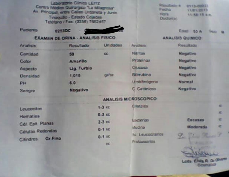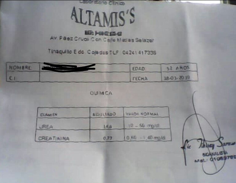 El paciente poseía un examen de orina de hace pocas semanas, sin embargo los valores de el examen oscilan entre los valores normales y nada parece irregular, aún así debíamos conocer el estado de la función renal, por esa razón es importante el análisis de urea y creatinina al igual que el valor de las proteínas en plasma.