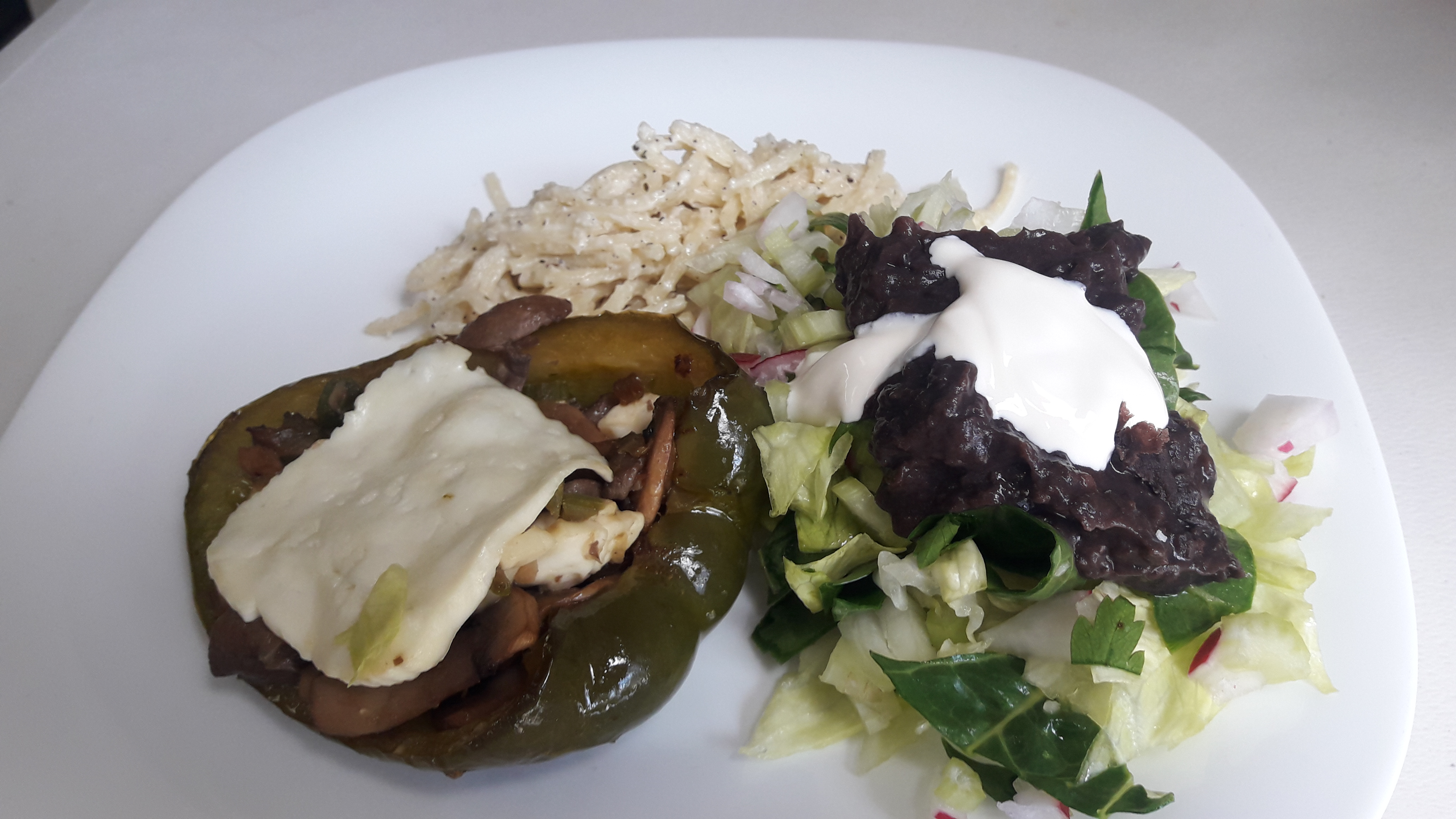 Es sencillo y fácil de preparar pero a todos les encanta. Son pimientos con champiñones, mantequilla, ajo, apio y queso panela. Para acompañar servimos un poco de pasta y ensalada.