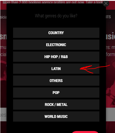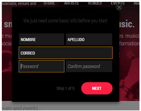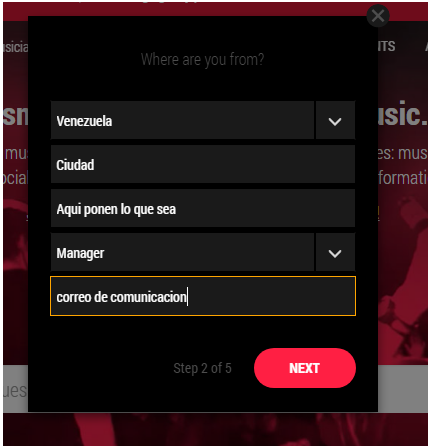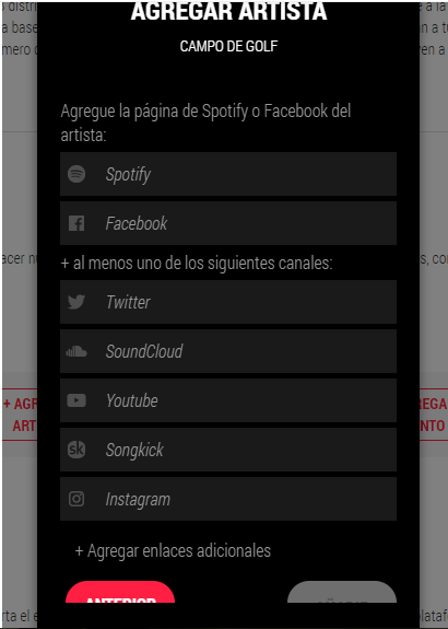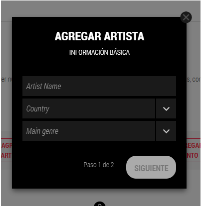 aca debes colocar nombre del artista, pais, y el genero (no debe estar registrado en la pagina)