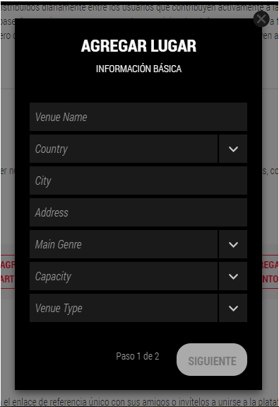nombre del lugar, pais, ciudad, direccion, genero musical promocionado en el lugar, capacidad y tipo de sitio (bar, disco, etc)