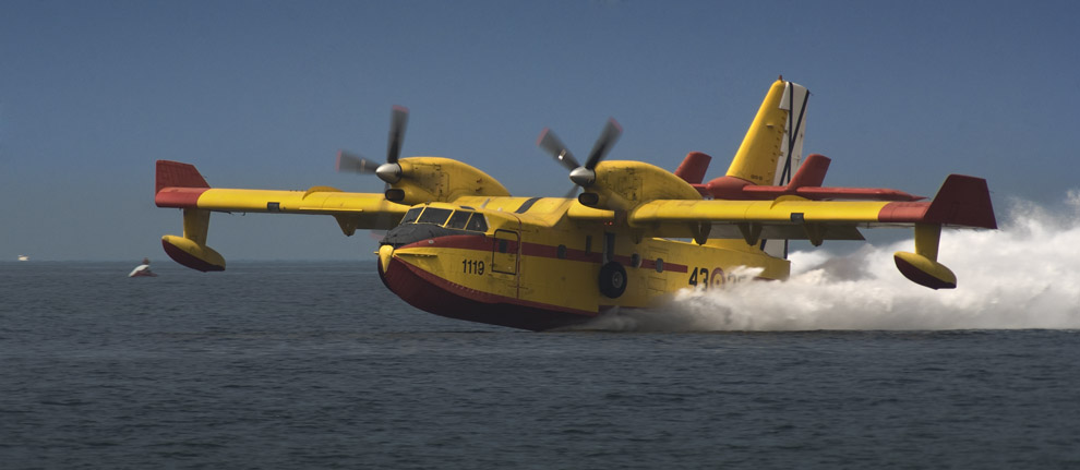 El hidroavión Canadair CL-415 es anfibio: Tiene rueda para aterrizar y flotadores para acuatizar. En sus tanques transporta agua y espuma, que arroja desde el aire para apagar incendios forestales. También tienen uso para el rescate en el mar y para diluir derrames de petróleos rociándolos con sustancias químicas.