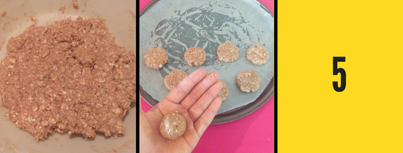 Saca la masa de la nevera, y con ayuda de una cuchara toma una porción y dale forma de pelota, luego presiona con tus dedos para formar la galleta. Precalienta el horno a 180°C o 356°F y hornea por 15 minutos.