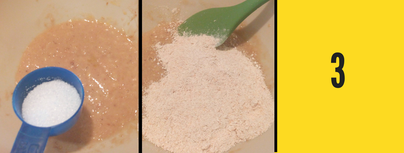 Agrega el edulcorante, en este caso utilicé 20g de xylitol. Luego vierte la harina de avena y el polvo de hornear.