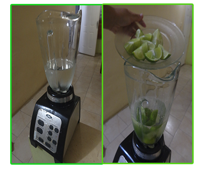 • En la licuadora colocamos 500 ml de agua y agregamos los limones ya picados, prendemos la licuadora y solo la dejamos que gire 2 veces y apagamos.
