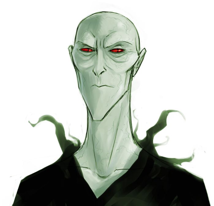 “El hombre delgado salió del caldero, mirando a Harry fijamente... y Harry contempló el rostro que había nutrido sus pesadillas durante los últimos tres años. Más blanco que una calavera, con ojos de un rojo amoratado, y la nariz tan aplastada como la de una serpiente, con pequeñas rajas en ella en vez de orificios