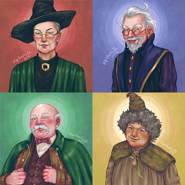 “El profesor Flitwick, un mago bajito y con el pelo blanco, salía llevando un sombrero viejo y un taburete de tres patas”.
