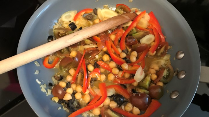 Heat vegetable oil in a skillet over medium heat. Stir in onion and garlic; cook and stir until the onion has softened and turned translucent, about 5 minutes. Add garbanzo beans, bell peppers, carrots, tomatoes, and olives; continue to cook until the peppers are slightly tender, about 5 minutes more.