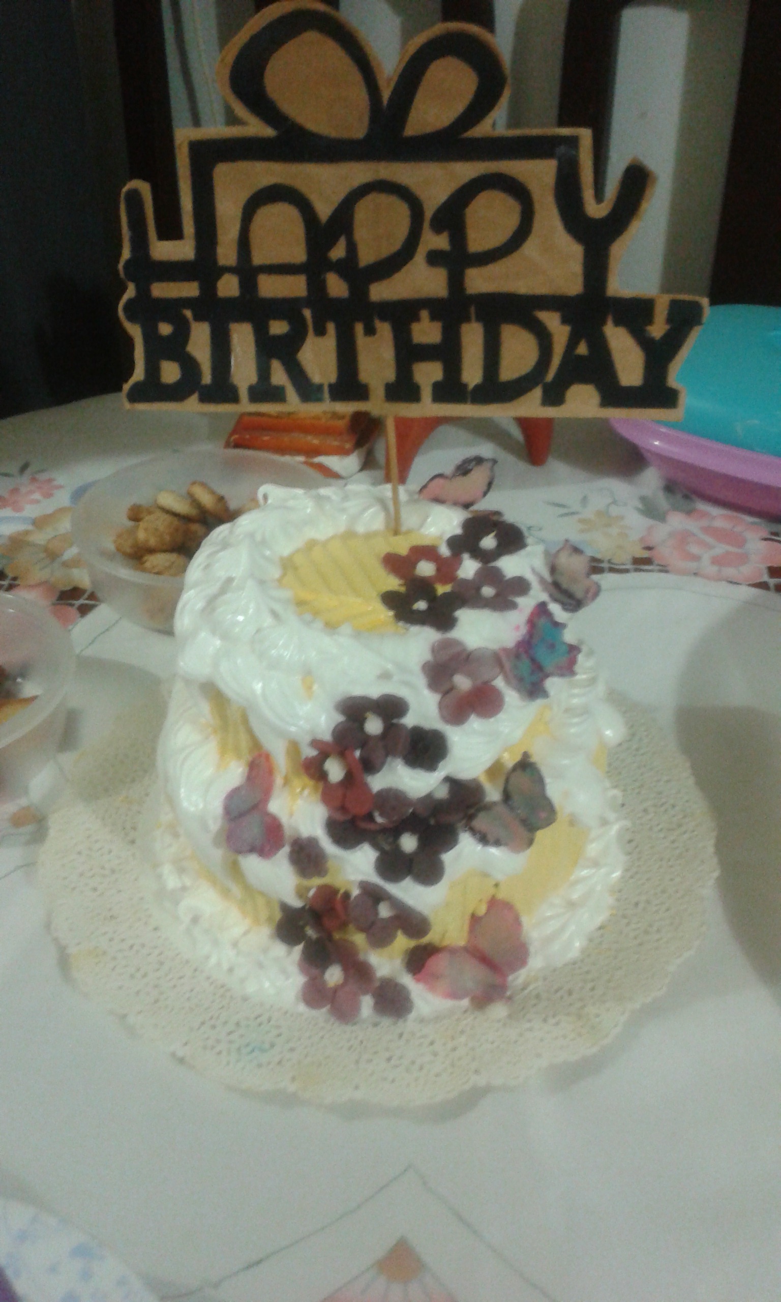 La torta con sus detalles favoritos flores y mariposas. El color de este año de la torta la escogió mi hijo