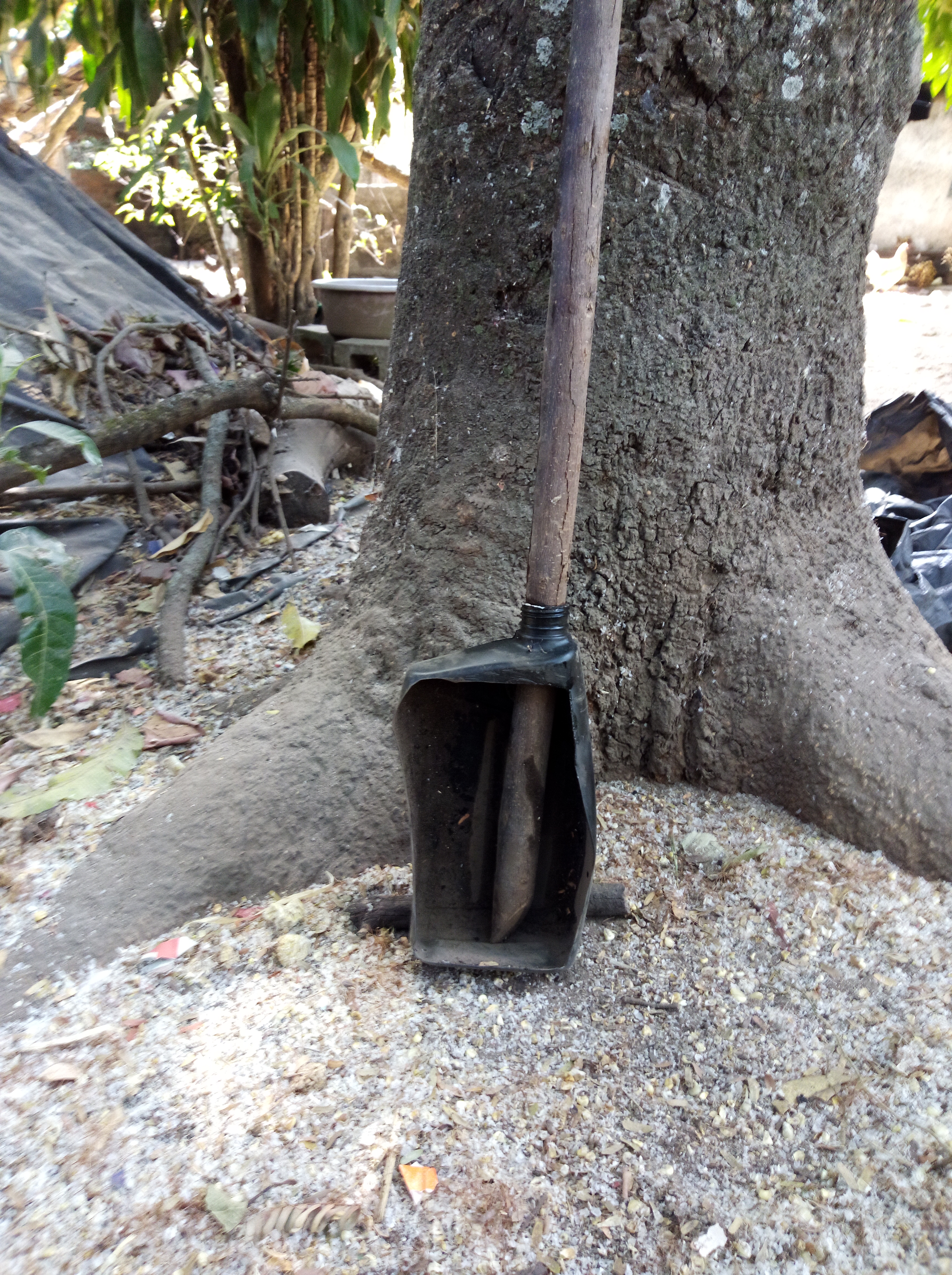Basta un poco de ingenio y podemos hacer maravillas con todo lo que podemos encontrar para poder darles un uso productivo y sobre todo que nos faciliten la vida, y de paso reutilizarlos para que puedan servirnos una vez más, así que manos a la obra a continuación les explico que hacer, primero buscamos una vara, garrote o pedazo de palo que podamos insertar en la boquilla del recipiente, una vez cazado procedemos con nuestra cuchilla a realizar un corte por la parte de afuera de forma rectangular como pueden ver en las figuras, y luego ya tenemos un instrumento parecido a una pala o escoba con lo cual podemos realizar diferentes actividades como recoger algo que no queramos hacer directamente con nuestras manos, como pueden ver aquí sea tierra, estiércol, ajuate, o cualquier cosa que se nos ocurra, como pueden ver aquí, incluso agua, o para limpiar un estanque de forma rápida y ágil.