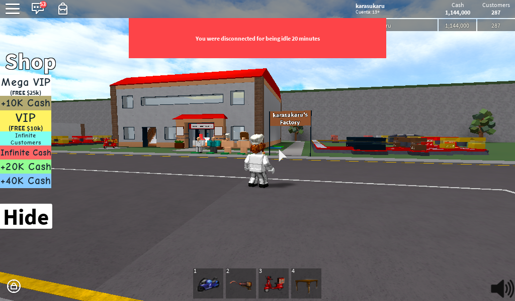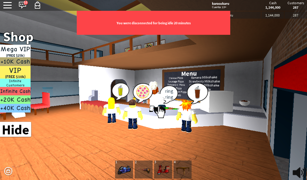 La primera imagen es de mi tienda de pizza llamada karasukaru pizzeria, esta imagen muestra la entrada de la tienda de pizza, y el personaje que ven en la imagen es donde pueden cambiar de ropa por una de cocinero, repartidor, sombrero del cocinero y caja de pizza en la cabeza del personaje.