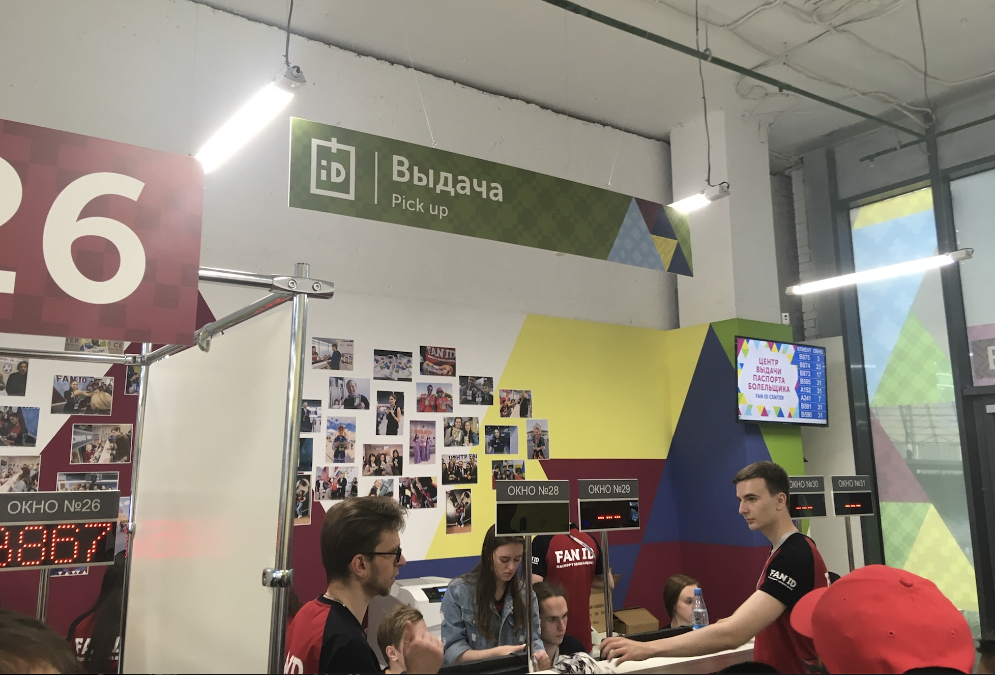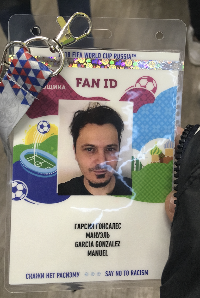 Consiguiendo el FAN ID para poder moverse gratis por los metros y trenes de Rusia. Me llamó la atención que la voluntaria traducía en directo con su teléfono porque no hablaba inglés