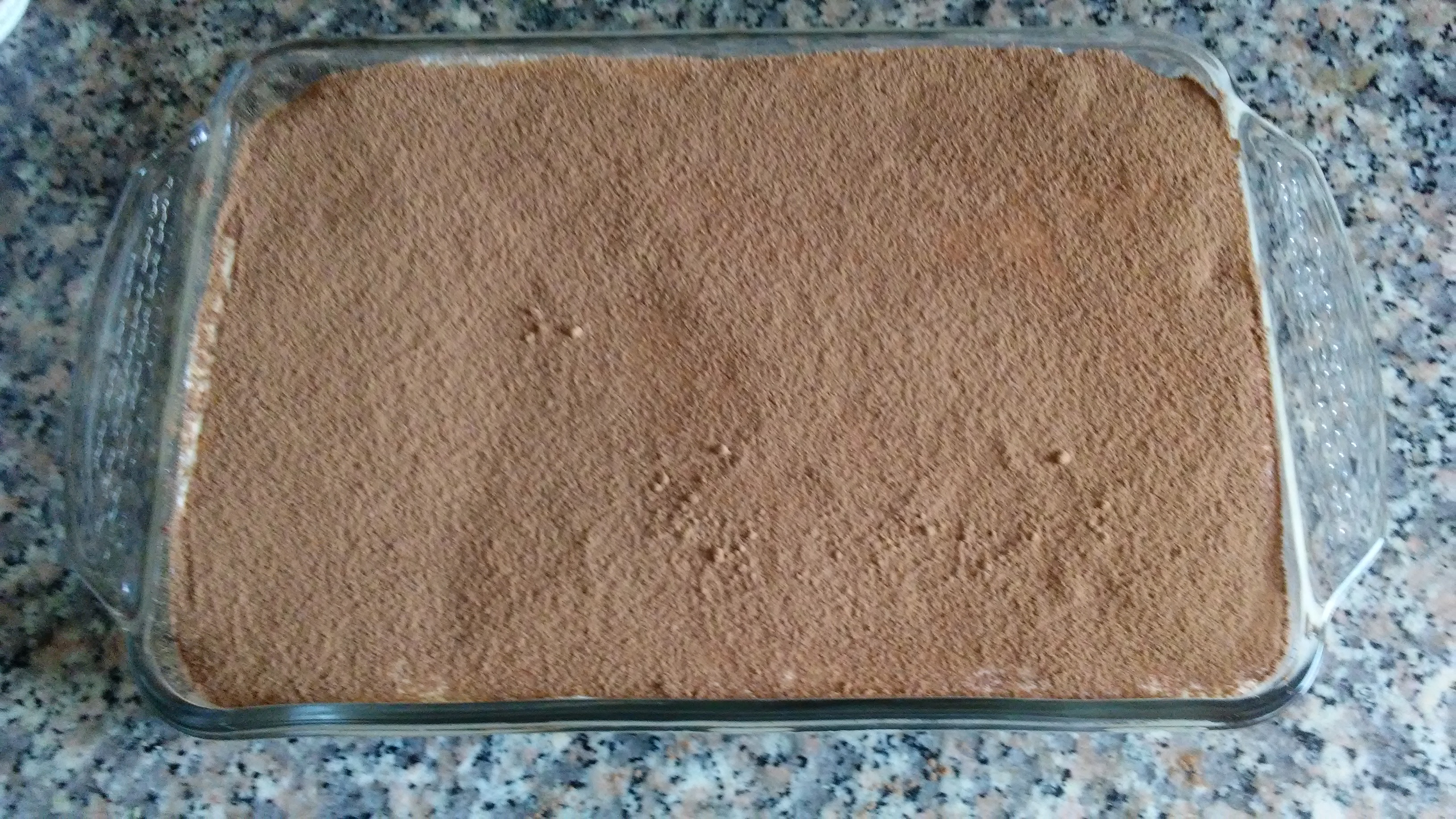 - En el molde hacer una capa de bizcochos y colocar encima una capa de crema, así hasta terminar con una capa de crema. Luego espolvorear cacao en polvo en la superficie.