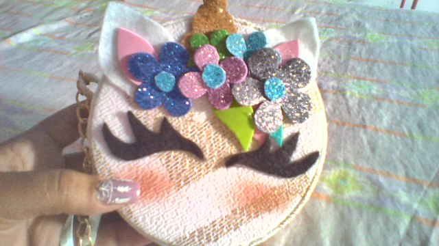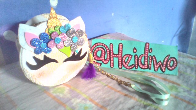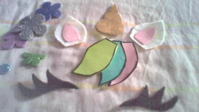 Luego que ya esta lista con su cadena para colgar vamos a empezar a decorar con los moldes ya recortados de unicornio.