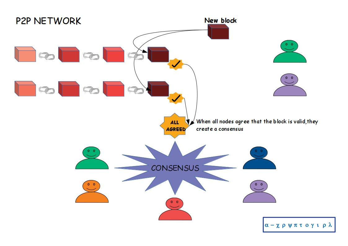 Para validar los bloques, todos los nodos aceptan si un bloque es válido o no. Esto lo realizan a través de lo que se denomina consenso