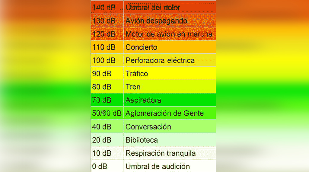 La intensidad de los sonidos se mide en decibeles, el oído humano posee un grado de tolerancia de 60 hasta 70 decibeles, el ruido de una aspiradora se ubica dentro de este rango. Al estar expuesto por un tiempo prolongado a valores superiores al grado de tolerancia el sistema auditivo es susceptible a daños permanentes. Un concierto o la música en una discoteca puede sobrepasar los 110 decibeles, después de los 130 podría haber pérdida total de la audición.