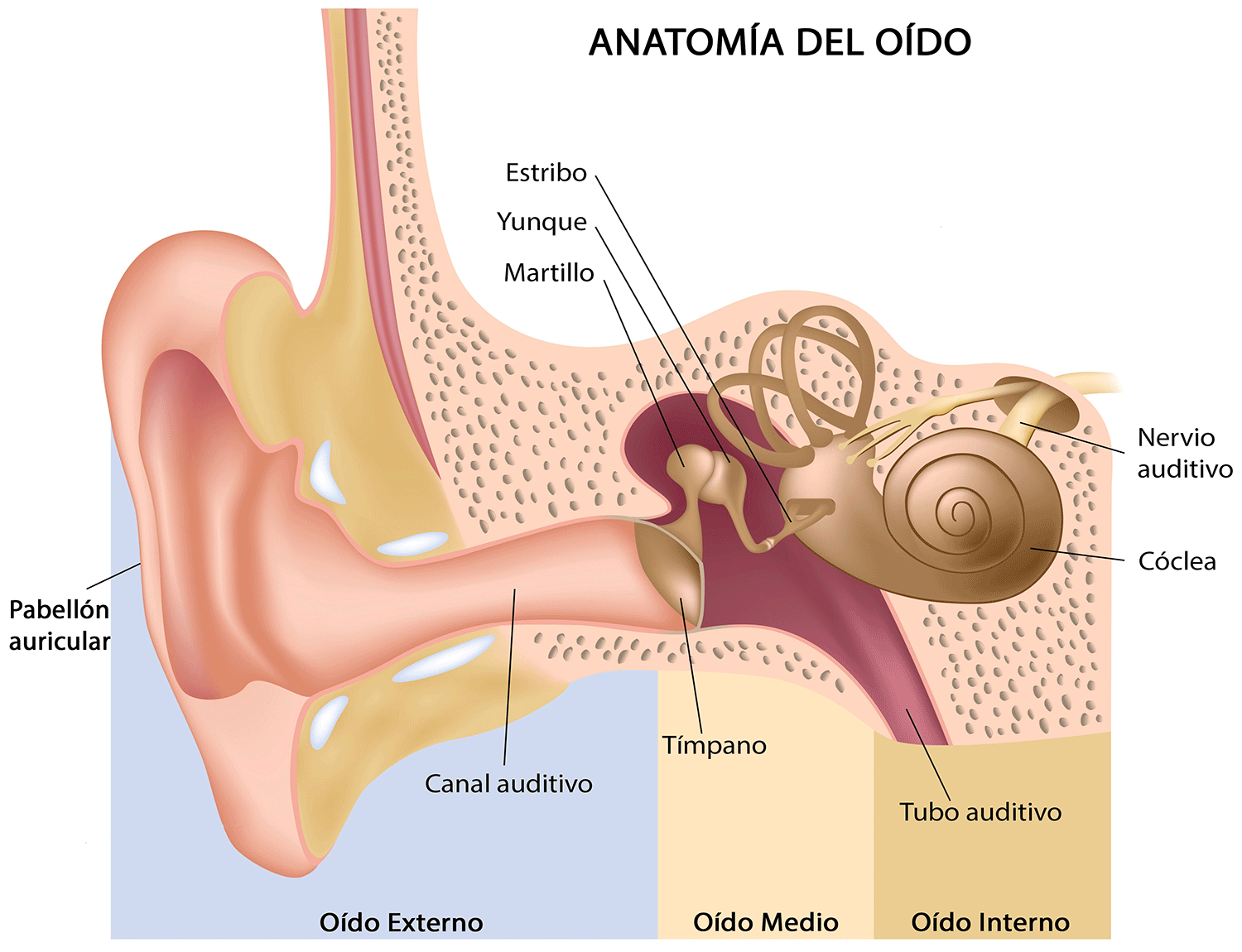 El oído está dividido en tres partes, el oído externo; conformado por el pabellón, el canal auditivo y el tímpano, el oído medio; constituido por una serie de huesecillos: el martillo, el yunque y el estribo, finalmente el oído interno; formado por el vestíbulo los canales semicirculares y la cóclea encargada trasmitir el sonido a través del nervio auditivo al cerebro.
