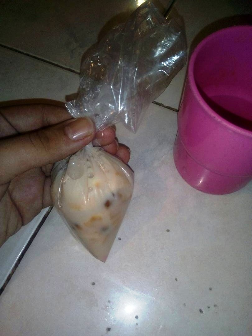 Sacamos del fuego y dejamos enfriar. Después de que esté un poco fresco le agregamos la cucharadita de vainilla y mezclamos, seguidamente tomamos nuestra bolsa plástica y la colocamos en el vaso para sostener mientras agregamos la mezcla.
