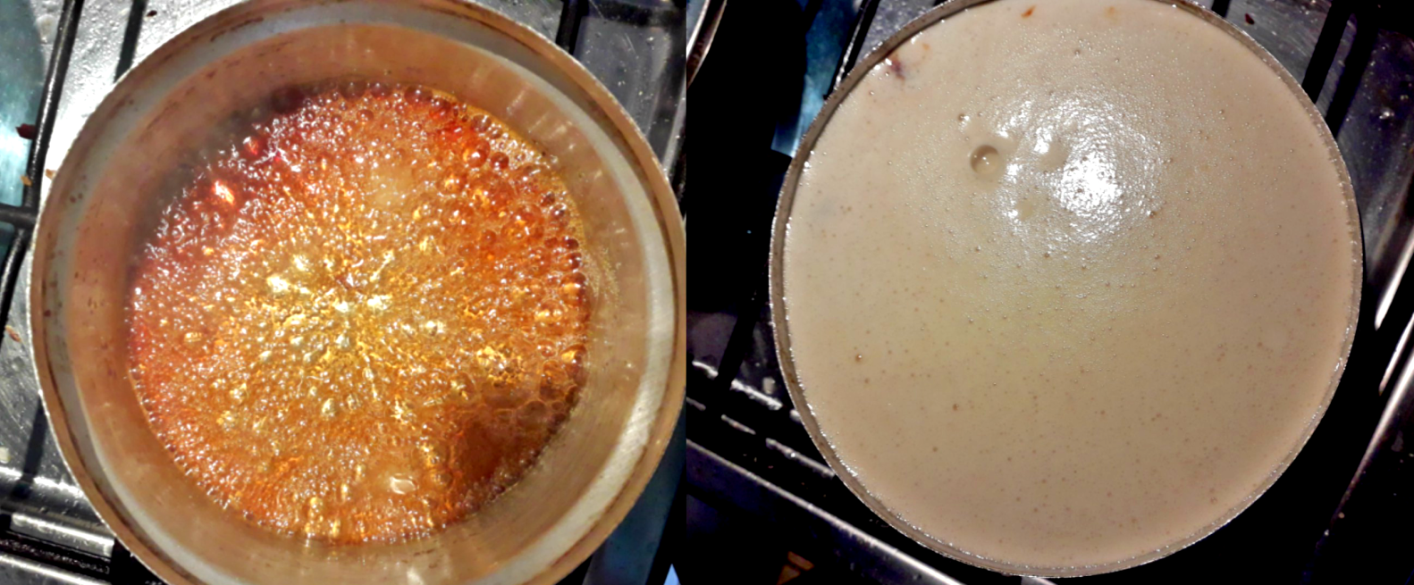 Para agregamos la mezcla sobre el caramelo cuando este de color marrón oscuro con mucho cuidado ya que el caramelo está caliente. Luego tapamos la quesillera y la colocamos en una olla a cocinar a baño María a fuego medio durante 30-35 minutos.