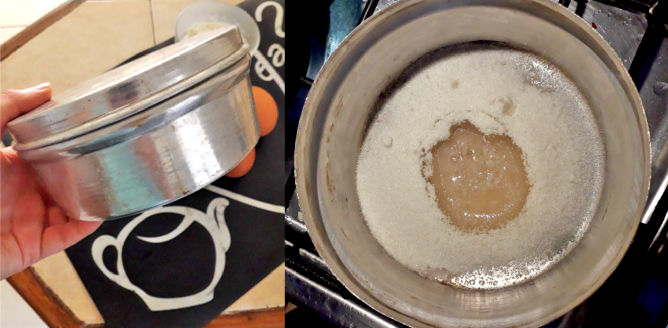 Primero debemos colocar las 4 cucharadas de azúcar con 4 cucharadas de agua. Dejar cocinando a fuego medio mientras hacemos el resto de la preparación estando pendientes de que no se queme el caramelo. Para el que no conozca la quesillera la primera foto corresponde a la misma y es algo así como un envase de aluminio con tapa.