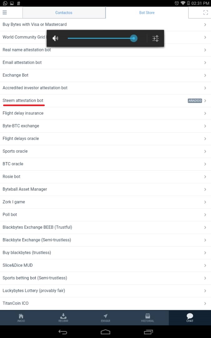 Luego vas a la pestaña de Chat -> Click arriba en Bot Store -> Click en Steem attestation bot