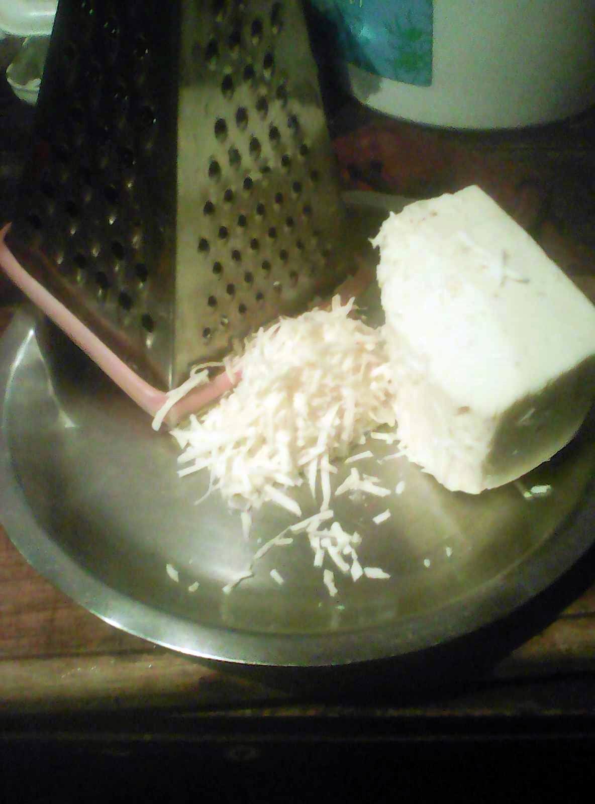 Con ayuda del rallador, rallaremos el queso y también picaremos nuestra carne ya fritada en cuadros pequeños.