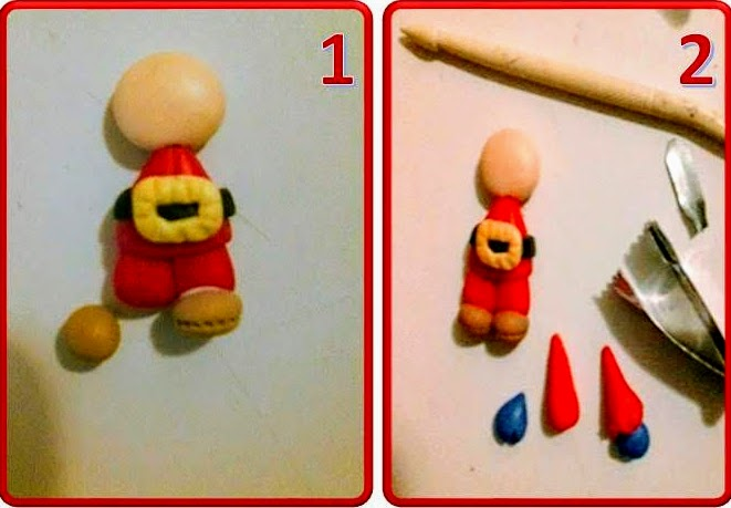 - Piernas: se realizan 2 pelotas color rojo y luego realizar gotas levemente aplanadas, pegar y dejar secar.
