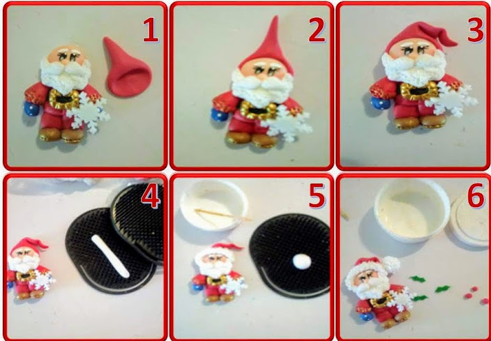 - Gorro: Hacer una gota con masa roja acocar e introducir la cabeza. Luego con masa blanca texturizar con los cepillos hacer el borde y el pompón. Decorar con un copo de nieve en la mano y hojas de navidad en el borde del gorro (cortadores de formas).