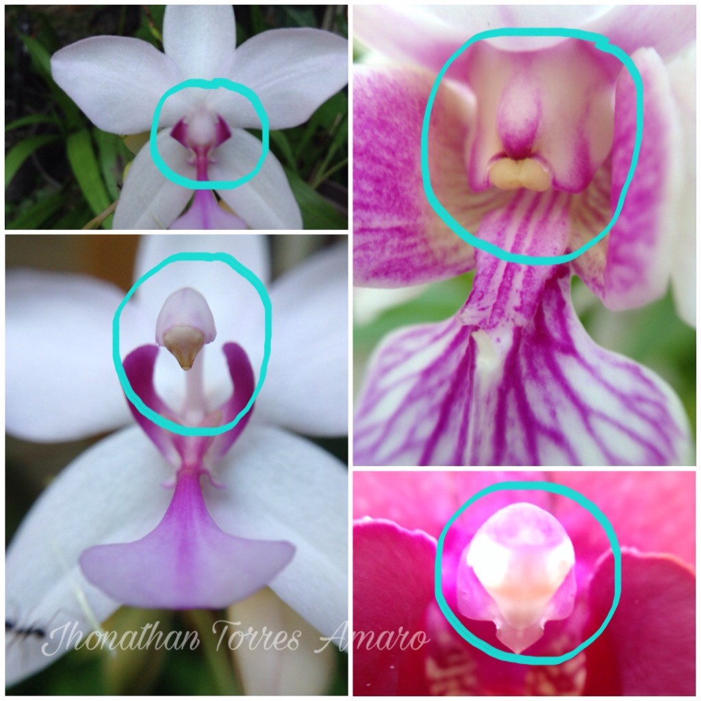 Figura 1. Varios tipos de flores presentes en las orquídeas. En igual orden que las fotografías: Paphiopedilum, Arundina, Oncidium, Vanda y Phalaenopsis. - Flores con labelo. Siempre hay tres pétalos. Uno de ellos ha experimentado cambios extraordinarios en su forma hasta ser completamente diferente de los otros dos. Suele resaltar por su color. Puede ser de mayor ó menor tamaño que los otros dos. Se encarga de arropar a los órganos reproductivos (Figura 2).