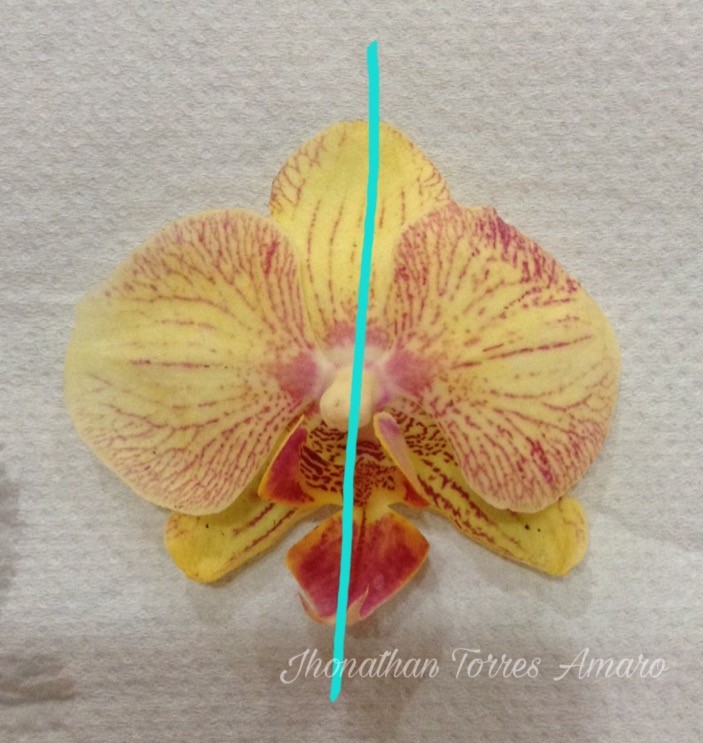 Figura 3. Flor típica de orquídea (Phalaenopsis) en que se señala su único plano de simetría. - Los órganos reproductivos están fusionados en la estructura llamada columna. Se trata de un órgano de la flor en la que se unen el estilo y el estigma (órganos femeninos) con las anteras (órganos masculinos). Presenta cerca de su extremo una región femenina, con una superficie receptiva para el polen (el estigma) y aparte, una región masculina, donde se alojan los granos de polen agrupados en masas. Es lo más distintivo de las orquídeas (Figura 4).