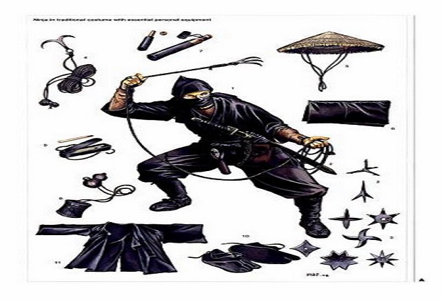 Si bien hoy en día los ninjas son representados como guerreros completamente vestidos de negro no es del todo cierto,puesto que su idea era el camuflaje y la infiltración en áreas enemigas por lo cual sus disfraces iban desde monjes,bailarines y titiriteros,este tipo de disfraces les servían para tener opciones de entrar al castillo de los enemigos y obtener información,pero no solo bastaba con parecer un monje o bailarín tenían que serlo completamente para no ser descubiertos por lo cual ellos estudiaban cada profesión por la cual se hacían pasar.