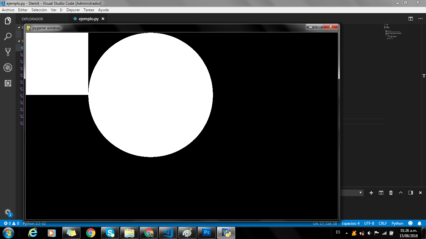 Excelente! :D ahora hagamos el circulo... De la misma manera que el cuadrado vamos a dibujarlo antes de while, abajo de la linea de código del cuadrado si quiere, y vamos a colocar: