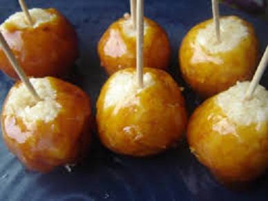 Retiramos de fuego luego agarramos las bolitas una por una y pasamos en el caramelo esto lo vamos hacer con todas las bolitas las colocamos en una bandeja previamente engrasada si deseas le puedes colocar palillos para cuando se enfríes retirarla de la bandeja. Se deja enfría y se retirar de las bandeja y listo para comer.