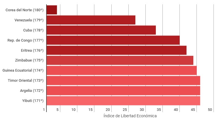 La economía más reprimida de las 180 analizadas es la de Corea del Norte, que tiene apenas 4,9 puntos. Completan el podio dos países latinoamericanos: Venezuela (27) y Cuba (33,9). Luego aparecen República de Congo (40), Eritrea (42,2), Zimbabue (44), Guinea Ecuatorial (45), Timor Oriental (46,3), Argelia (46,5) y Yibuti (46,7).