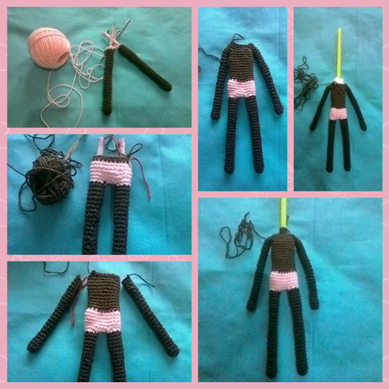 En el siguiente paso se comienza a tejer el cuerpo. Se cambia el color del hilo para trabajar lo que será la ropa interior. Se unen las piernas con 3 cadenas y comienza la primera ronda que cerrara con un total de 26 pb. En la vuelta siguiente se realiza un aumento quedando un total de 28 pb y se subirán 3 vueltas más para finalizar la ropa interior. Se cambia el color del hilo y se continua con el cuerpo de la siguiente manera: