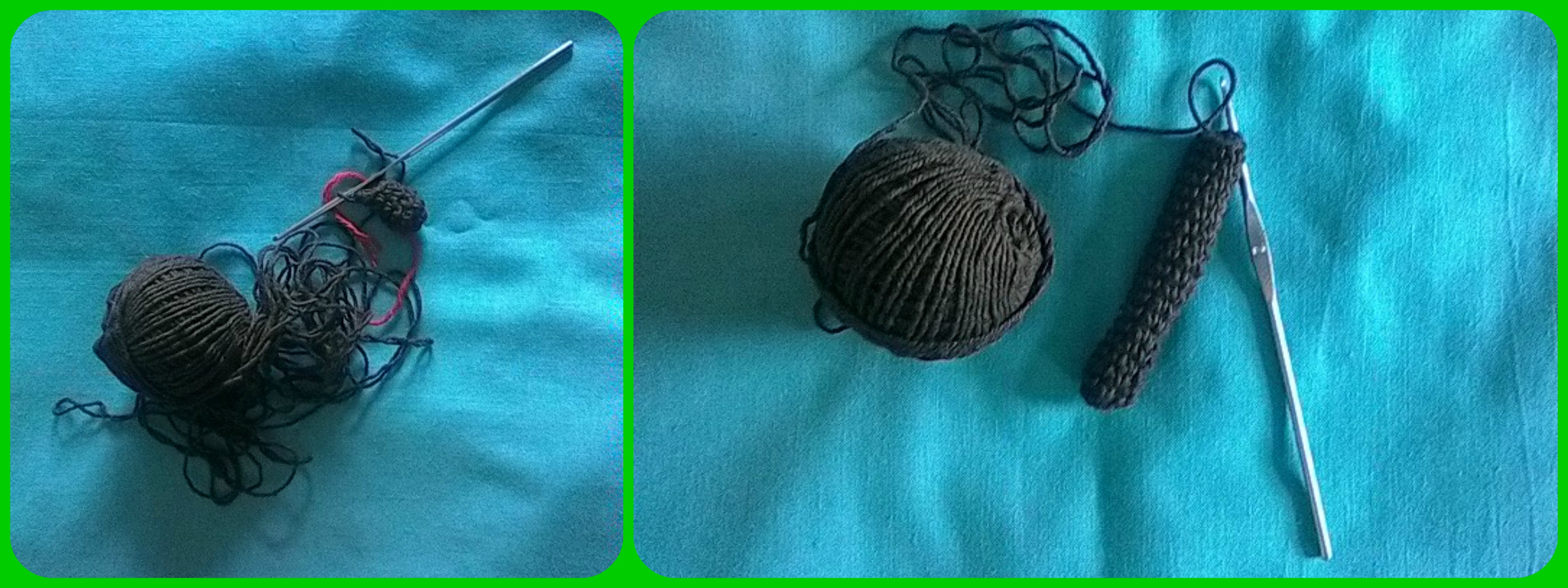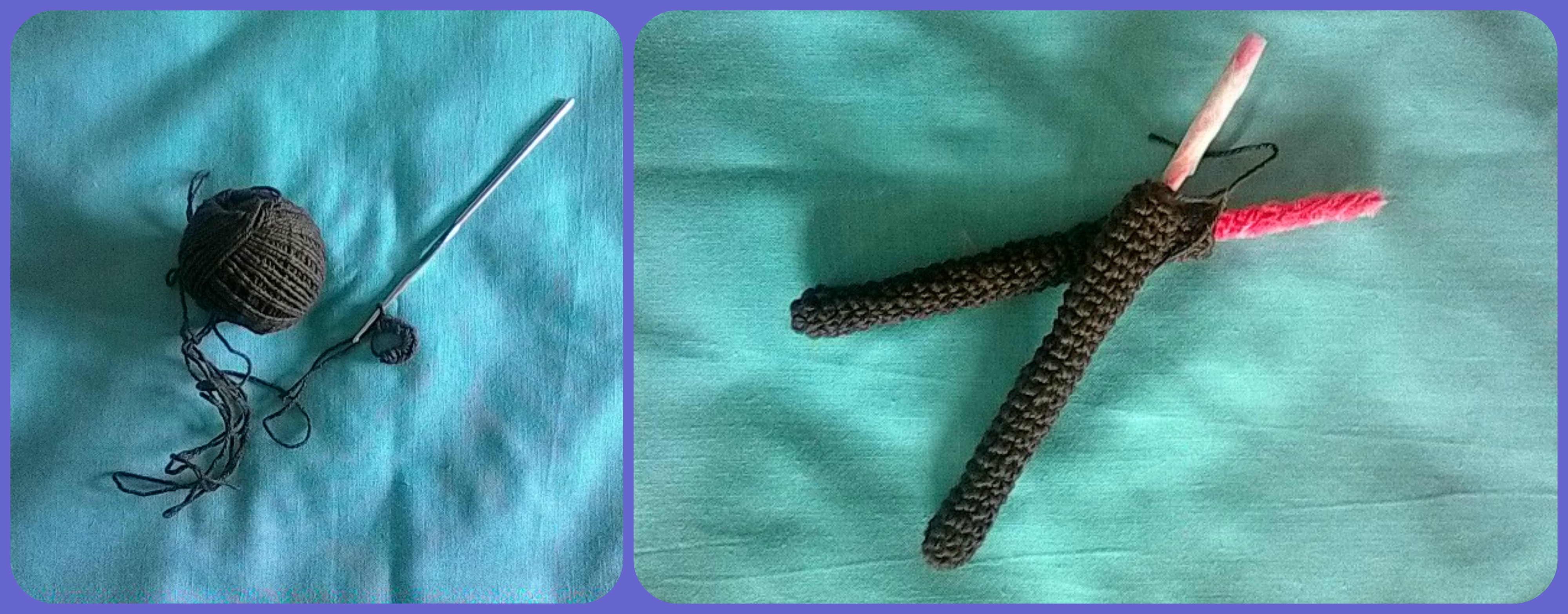 Comencé mi muñeca realizando primeramente los brazos y luego las piernas. Los primeros los inicie con un anillo mágico dentro del cual se tejen 6 pb (puntos bajos). Una vez listos se cierran y se levanta la primera vuelta tejiendo un punto sobre cada punto de los anteriores y se va subiendo hasta completar 22 vueltas. Una vez listos se introducen los limpiapipas doblados a la mitad, se corta el sobrante y se reservan hasta que se necesiten.