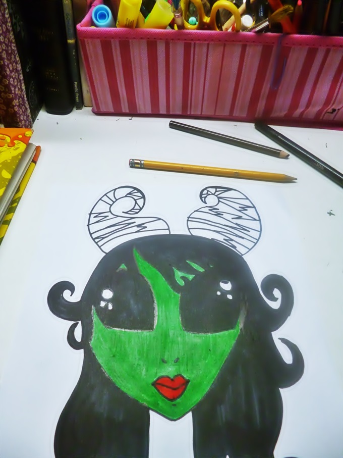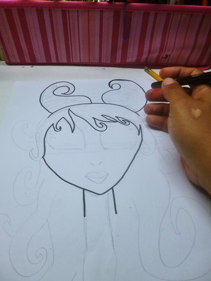 | Luego de remarcar todo el dibujo comencé a pintar la cara de LIBBY el cabello fue el que me llevo un poco mas de tiempo porque no sabia si dejarlo largo o corto. |
