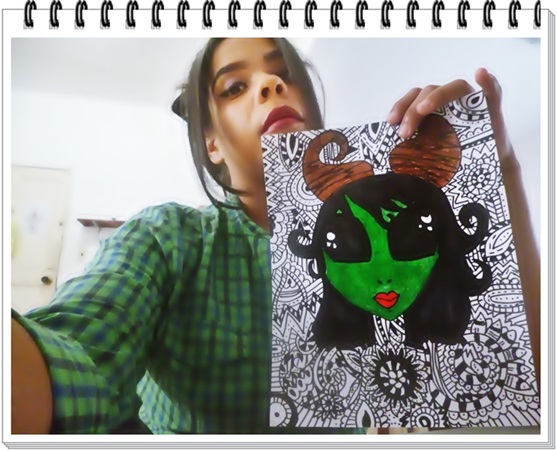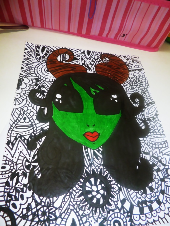 | El fondo va hacer zentangle, como pueden ver ya tenía la parte de abajo lista. Para finalizar hice los últimos retoques y me concentre en los zentangle que olvide que LIBBY tenía el cabello largo. |