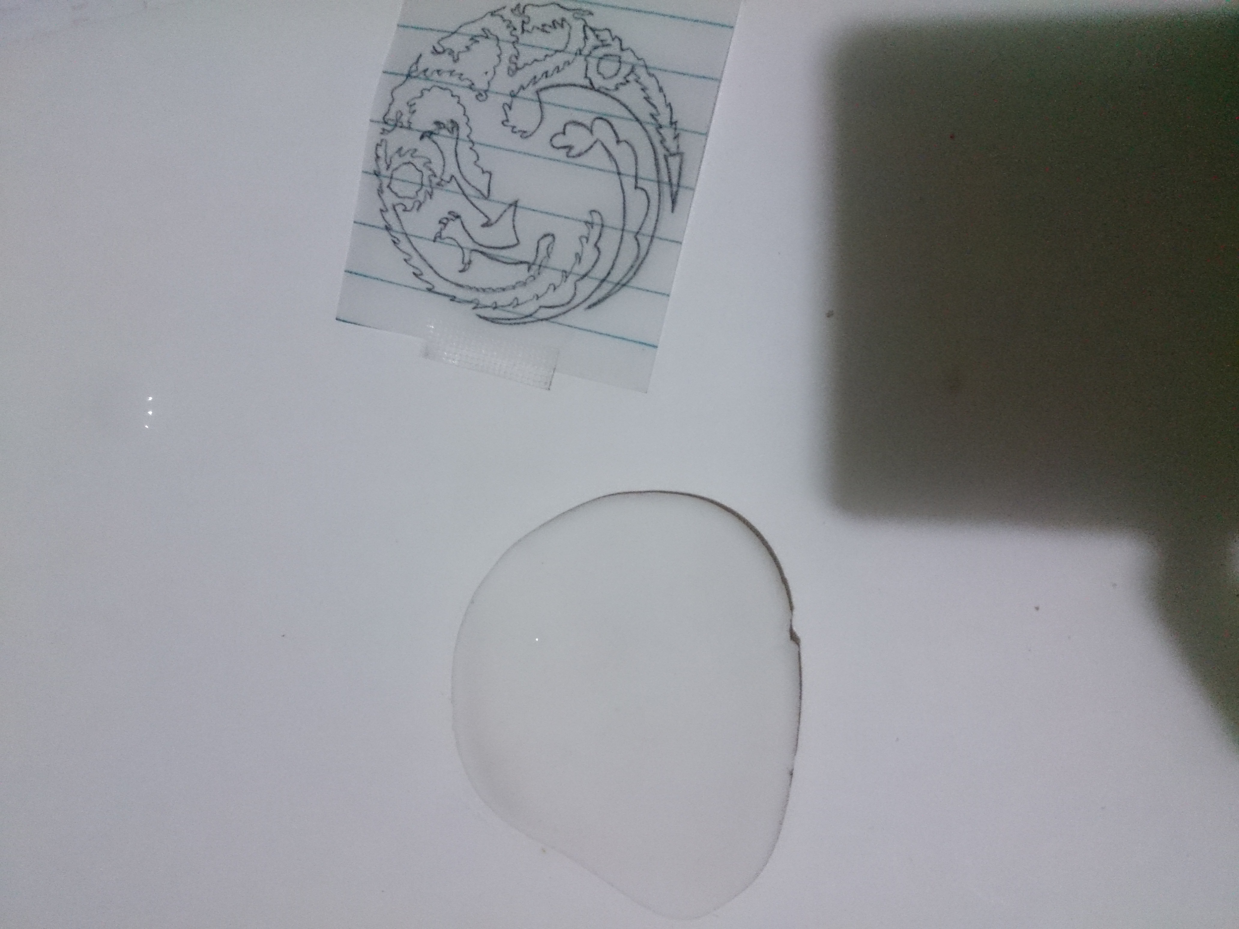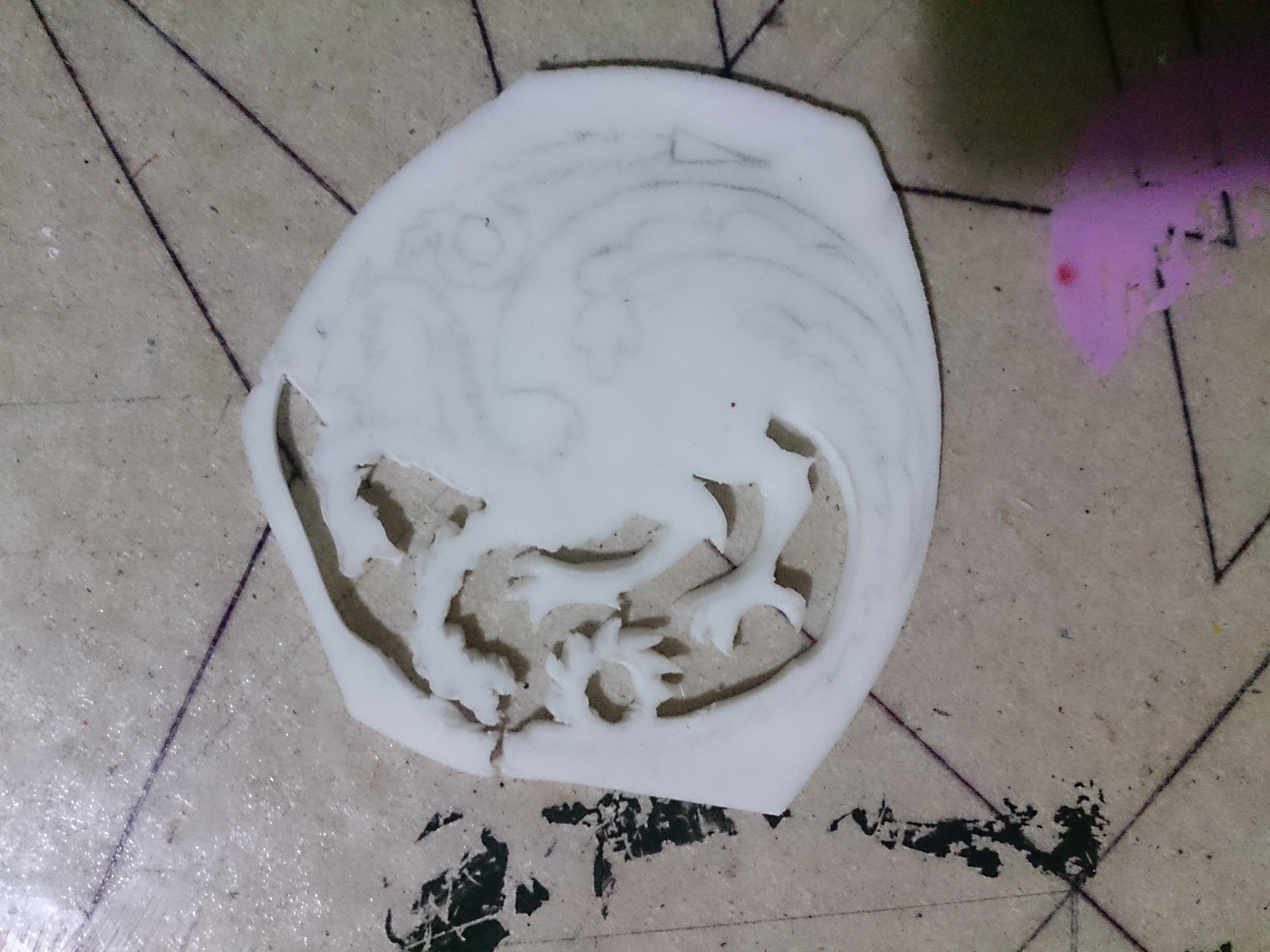 Una vez cortado el emblema, con un Estilete realizamos todos los detalles a toda la pieza para luego pegarla con Pega Blanca sobre la Base de Masilla Das realizada con anterioridad, dejamos secar, y procedes a fondear toda la superficie de negro.