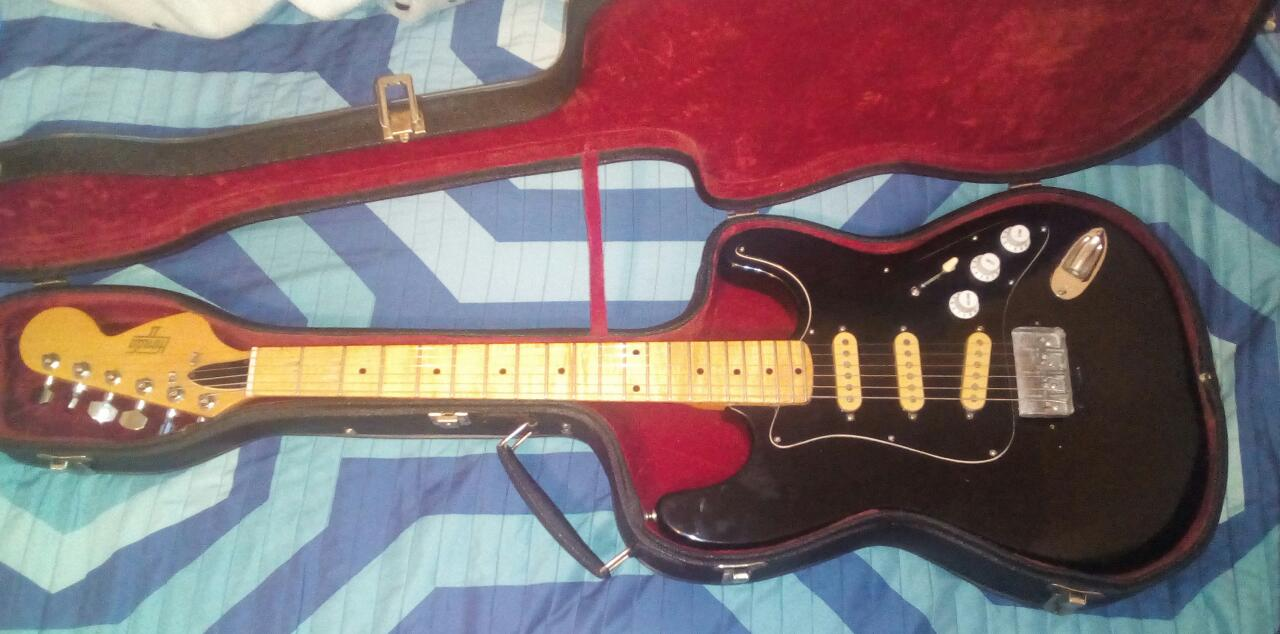 Tenía razón, encontré la guitarra y mucha información de ella, su referencia es HONDO II H-760-B Stratocaster, fabricada en Japón en el año 1980 (fue el único año que fabricaron ese modelo), avaluada en unos 700 dolares y buscada por muchos coleccionistas.