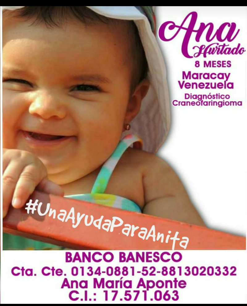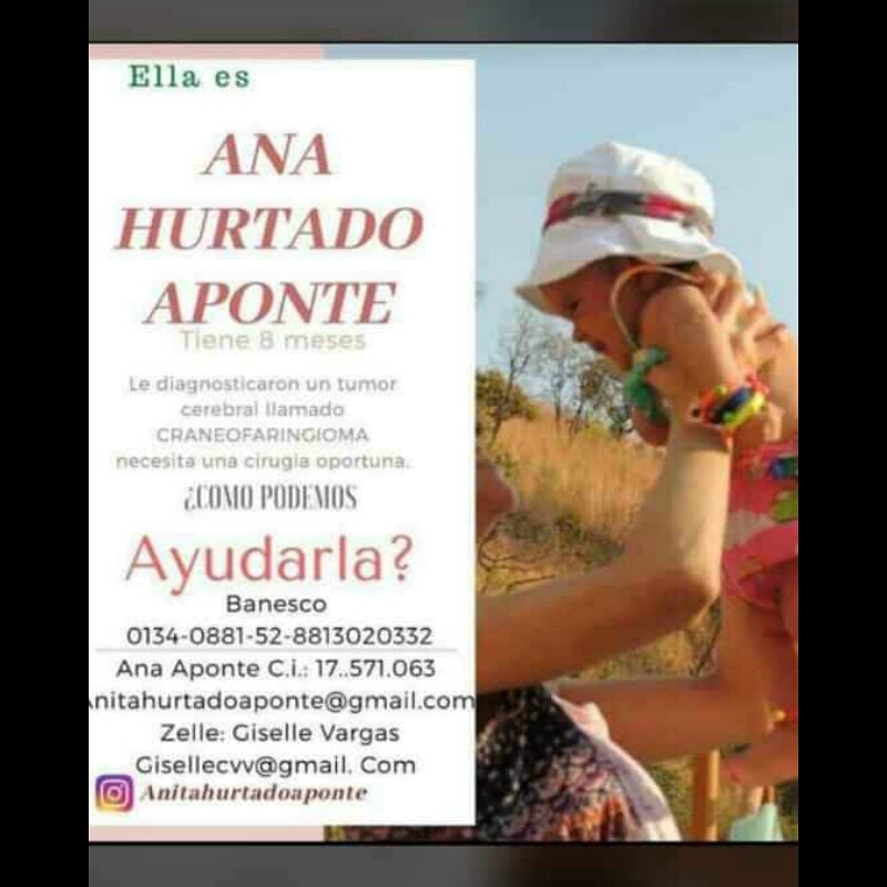 Ella es Ana una nena de 8 meses de edad, venezolana, diagnosticada con un craneofaringioma, un tumor cerebral. Ayudala a salir exitosa de su operación y tener todas las oportunidades de la vida así como cualquier otro niño.