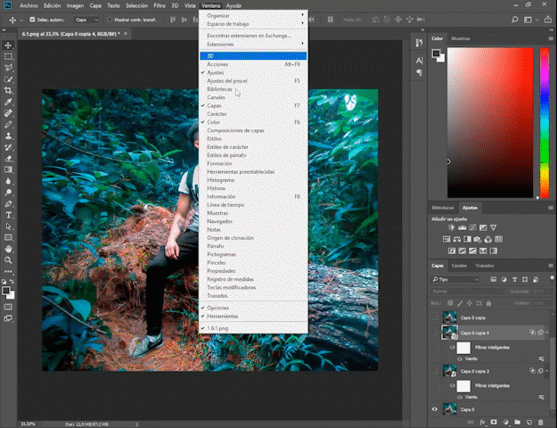 • Ahora en la pestaña “Ventana” activamos la línea de tiempo y vamos creando poco a poco cada cuadro, la idea es que crees los fotogramas con los efectos que quieras, por ejemplo en mi caso el primer fotograma seleccionado solamente deje visible la capa original, en la segunda la capa con efecto de lentes 3D, en la tercera capa puse visible la capa de selección escalada, en la cuarta oculte la capa escalada, en la quinta active la capa con efecto de viento, en la sexta la otra capa de viento, y también hay que ponerlo en infinito para que se repita sin parar, y configurar los tiempos, para la original 1 seg y para las demás 0,1 seg.