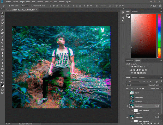 • Luego duplicamos la capa original y la convertimos en objeto inteligente, en Filtros>Estilizar>Viento agregamos dicho filtro en trememundo y con dirección derecha.