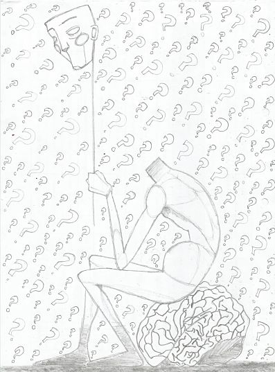 Al ver el dibujo observo a un hombre pensativo, con muchas preguntas sin respuestas, con muchos problemas sin resolver; con una máscara social "feliz" para no demostrar lo que realmente le sucede. A la mayoría de las personas les pasa esto ya que no les gusta demostrar su rabia, su tristeza, su dolor... Prefieren salir y sonreír al mundo; y no esta mal hacer eso.