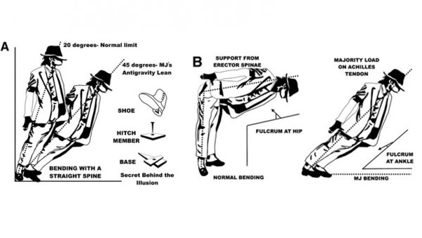 Durante mucho tiempo creía que era un truco de edición o un efecto especial , evidentemente nunca ni mis amigos ni yo pudimos ni en sueños realizarlo al menos con el moon walk pudimos realizar una imitación mas o menos decente, pero esos 45 grados eran una misión imposible , hace algún tiempo leí sobre unos zapatos especiales que se pegaban al piso aun así no me convenció del todo pero tenia sentido, en estos días encontré una noticia sobre un grupo de científicos admiradores del “Rey del Pop”, quienes elaboraron una explicación científica de cómo el cantante fue capaz de realizar uno de sus pasos más famosos, el de inclinarse hacia adelante con el tronco recto, según un estudio publicado hoy en Journal of Neurosurgery.